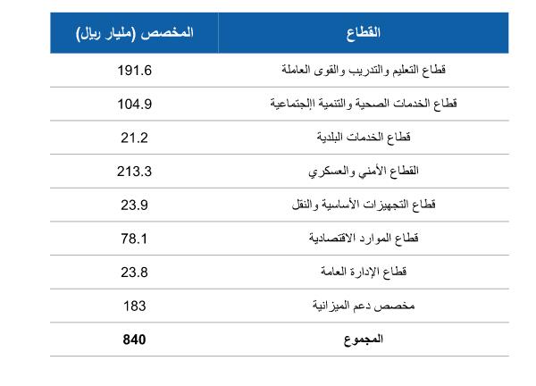 أعلنت وزارة المالية أن حجم الإنفاق العام المقدر في ميزانية العام 2016 بلغ 840 مليار ريال، استحوذ القطاع العسكري والأمني على 213 مليار منها تشمل وزارات الداخلية والحرس الوطني والدفاع والاستخبارات، فيما تم تخصيص 191 مليار ريال لقطاع التعليم تشمل مشاريع المستشفيات الجامعية.